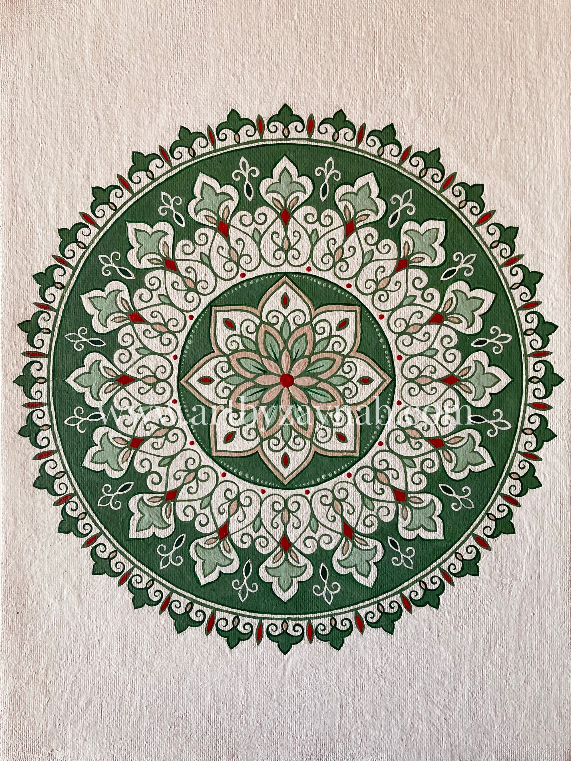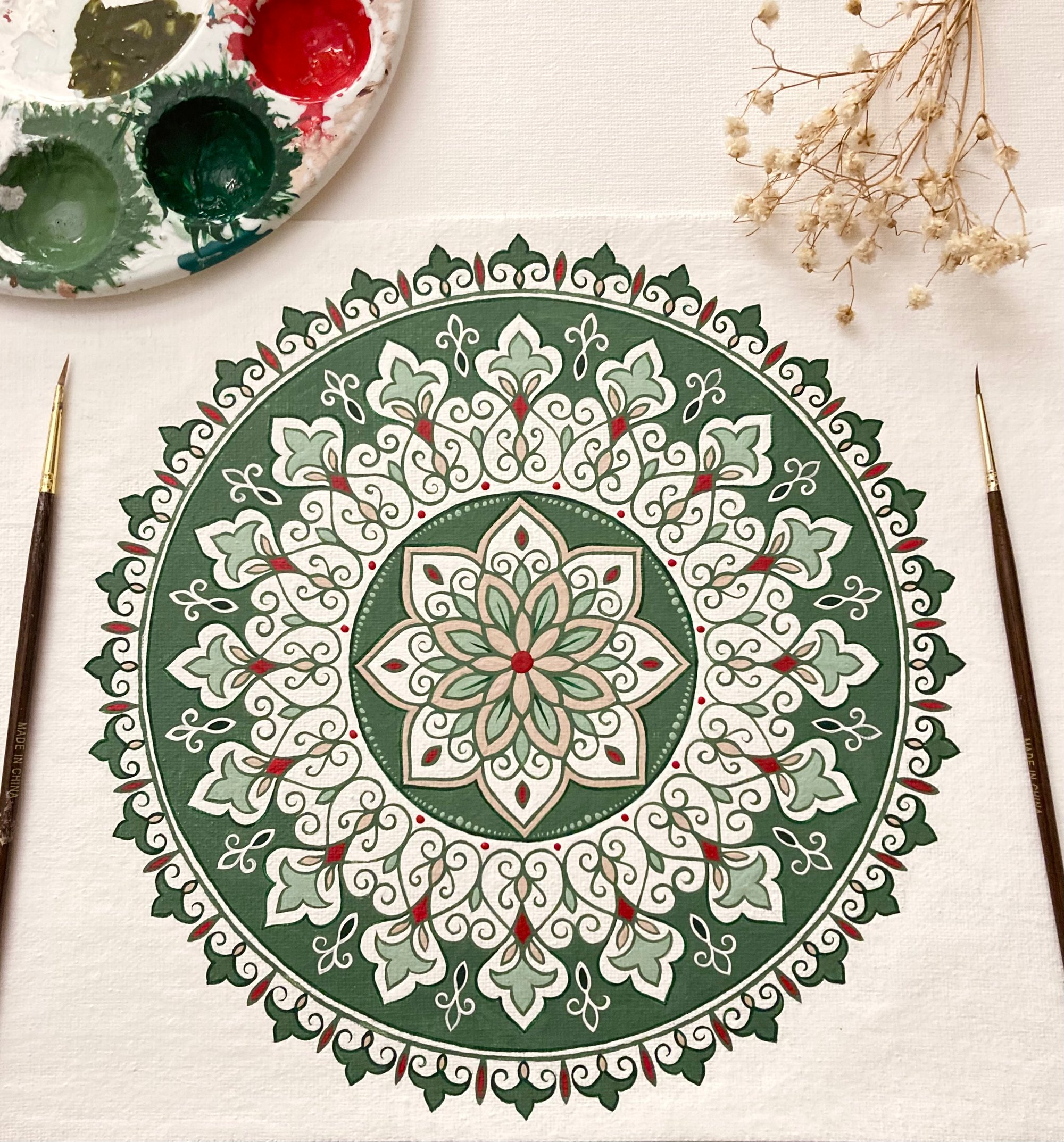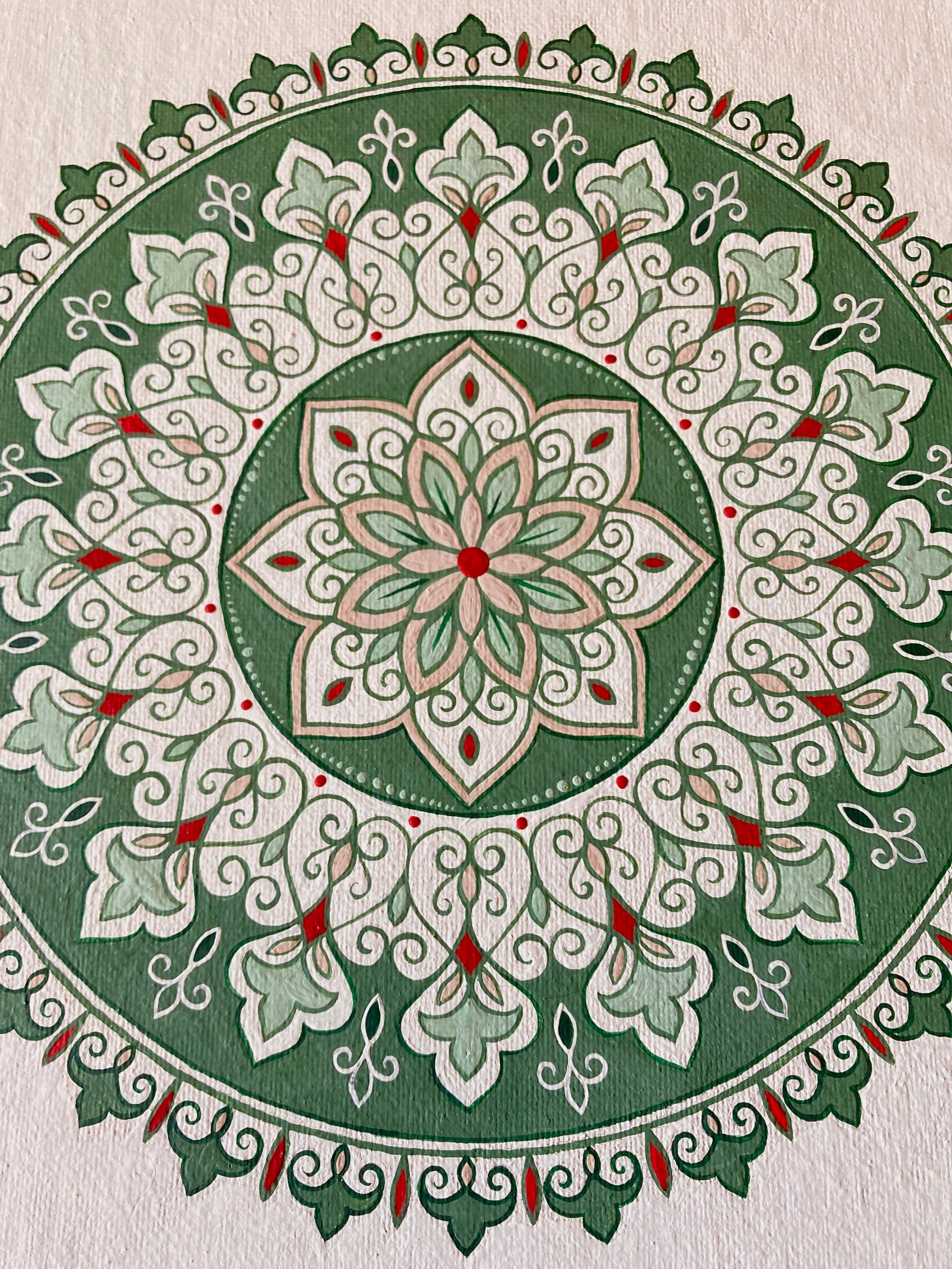 A hand-designed and hand-painted mandala inspired by Turkish and Persian patterns.