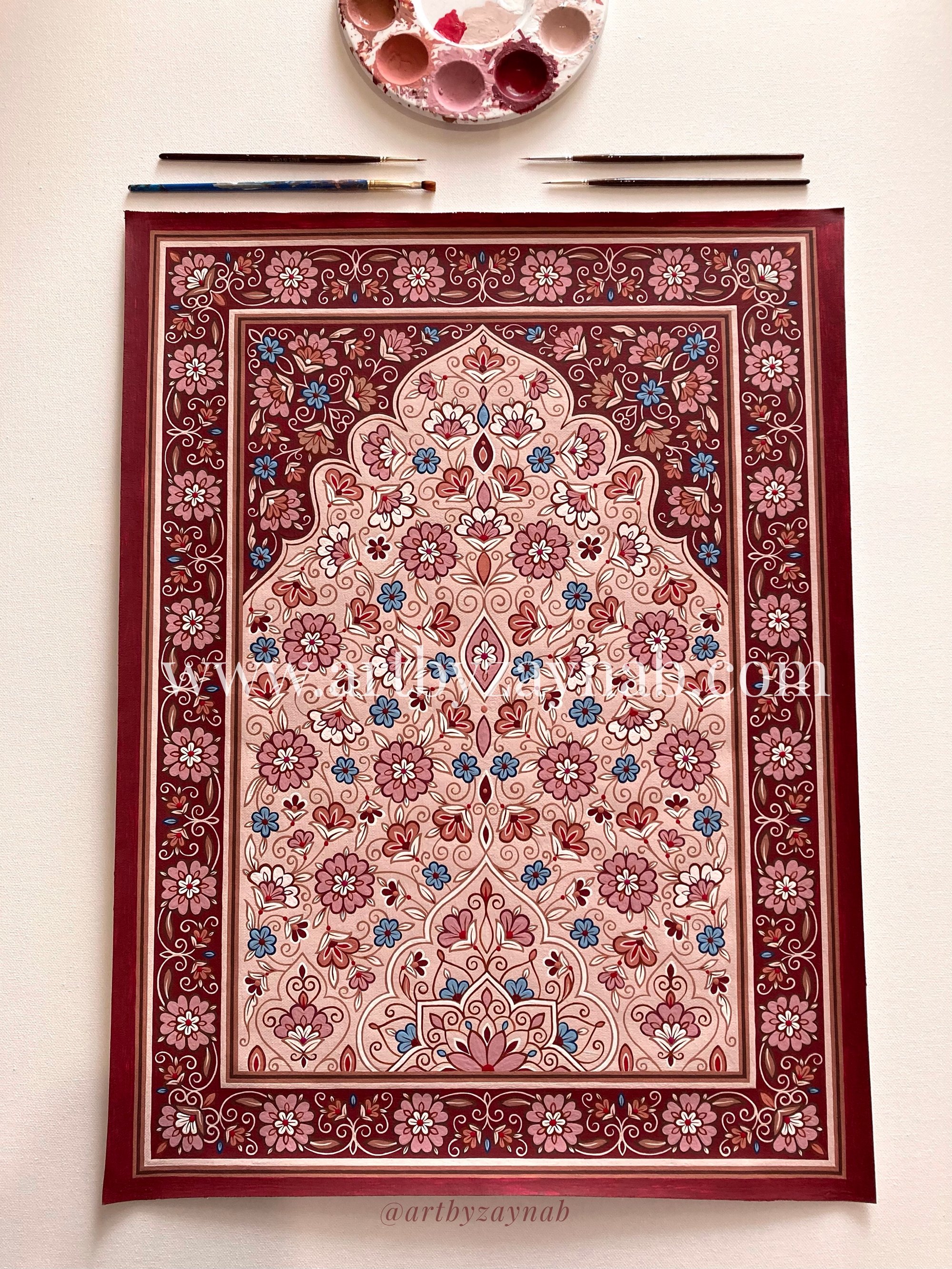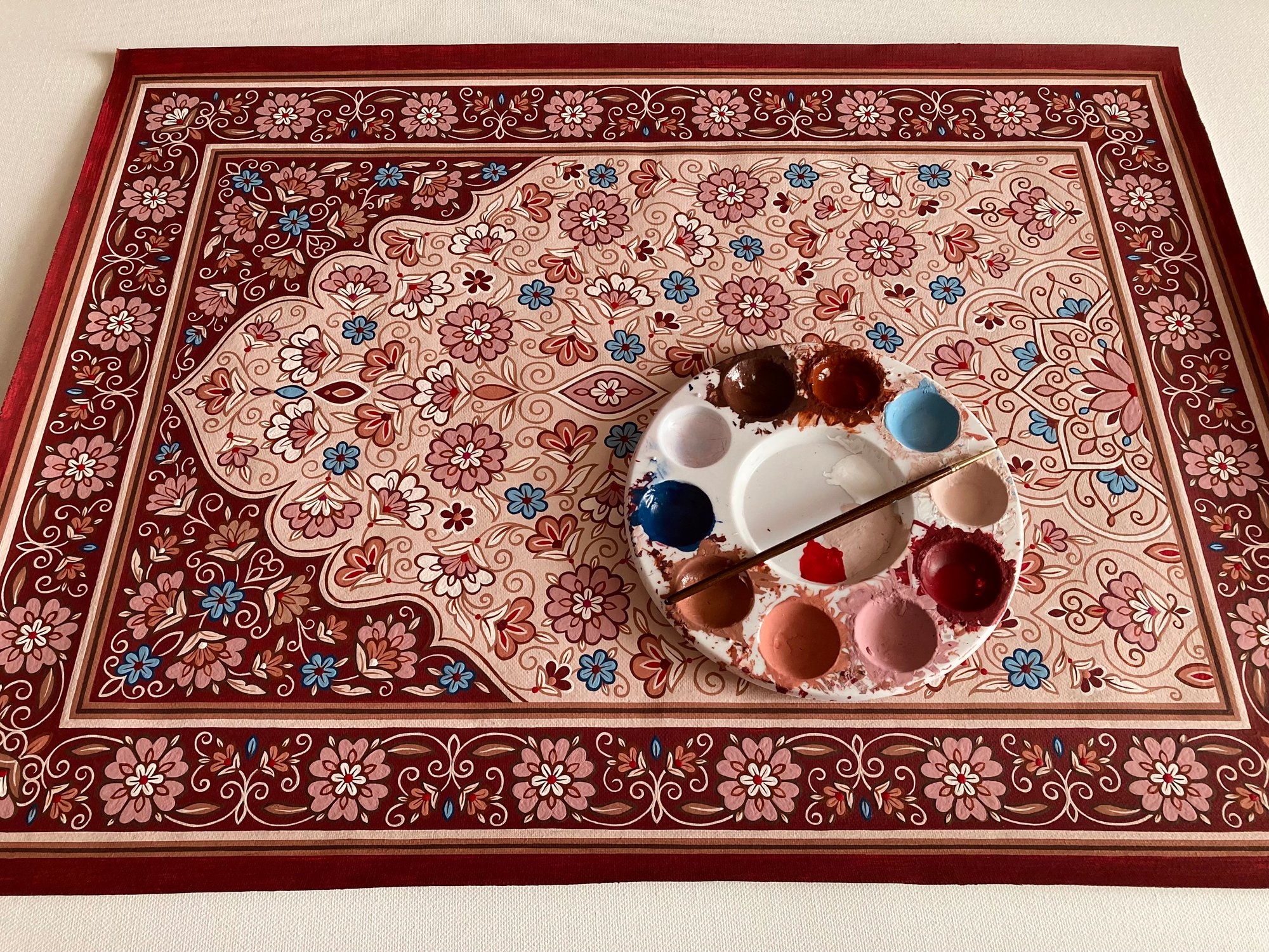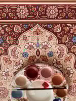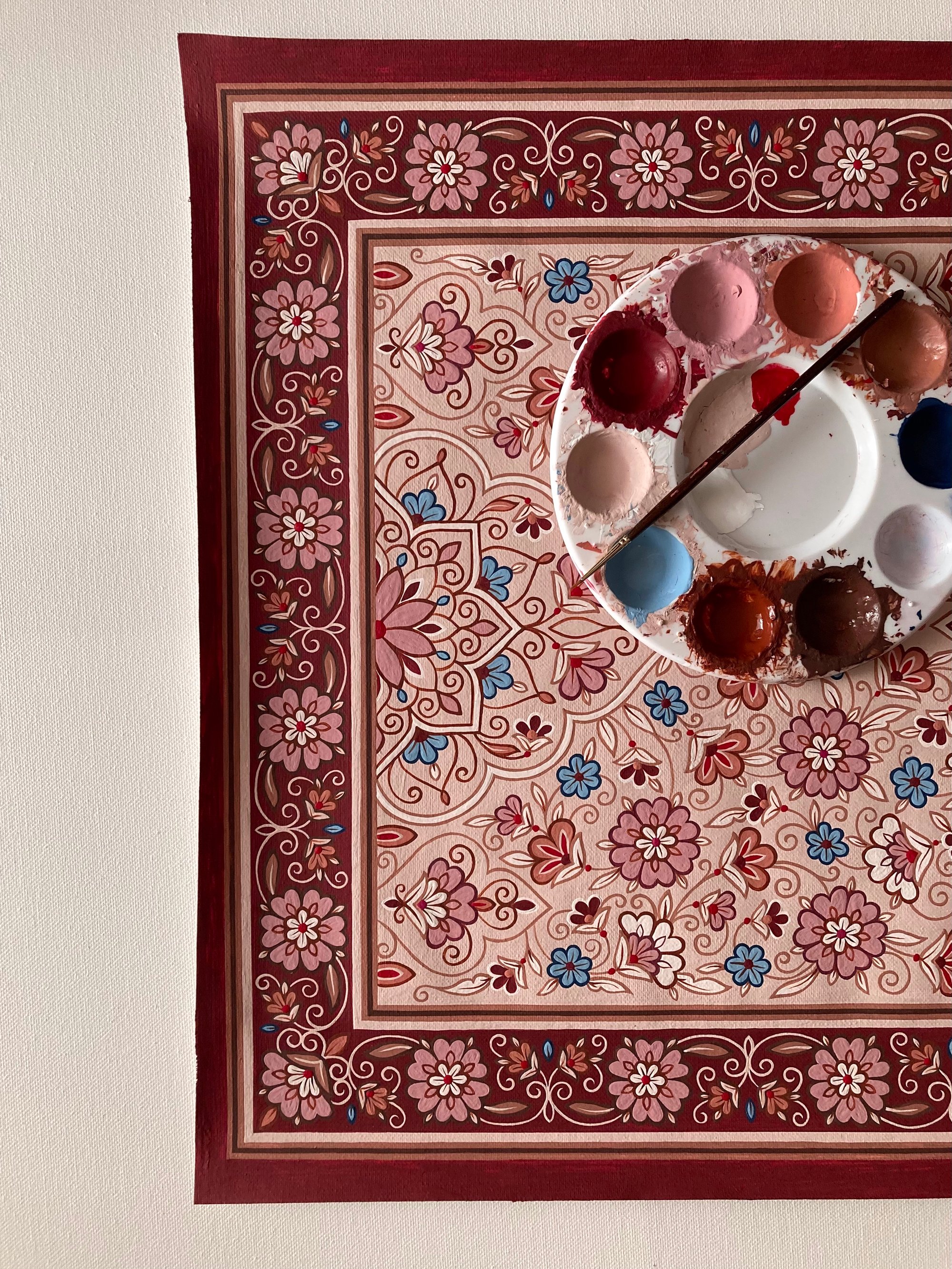 Inspired by the elegance of Persian carpets and hand-painted in vibrant acrylics on cotton canvas. Bahār (the Persian name for spring) is a painting I created to celebrate spring in full bloom, renewal, beauty, and tradition. May this painting allow you to wander into a world of rich colour harmonies and intricate details.